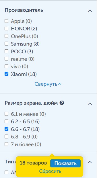 Совет: чтобы видеть список товаров с определенными характеристиками, мы рекомендуем последовательно выбирать желаемые параметры, начиная с более важных. Так шаг за шагом вы сокращаете размер самого фильтра, исключая для себя неподходящие варианты.