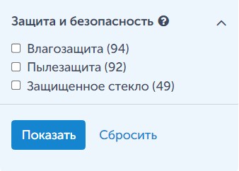 Кликом можно как устанавливать, так и отменять выбранные значения. Отменить сразу все значения выбранных параметров можно, нажав на кнопку «Сбросить» в конце фильтра.