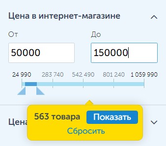Пользоваться данным фильтром можно двумя способами: указать конкретное числовое значение в полях «От» и «До», а также передвигая ползунки, установить минимальную и максимальную цены. При этом после установки каждого из ползунков фильтр будет перезагружаться.