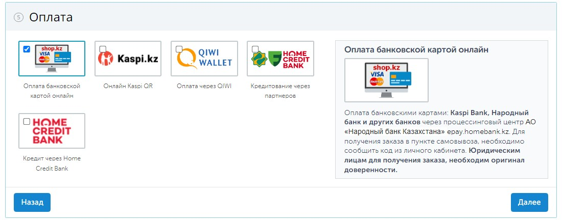 Примечание: если вы не нашли нужный способ оплаты, убедитесь, доступен ли он при выбранном способе доставки. Для этого ознакомьтесь со всеми способами оплаты.