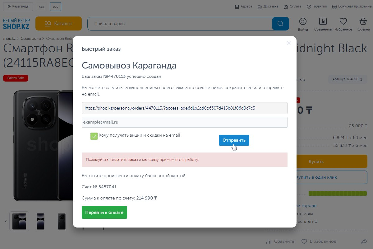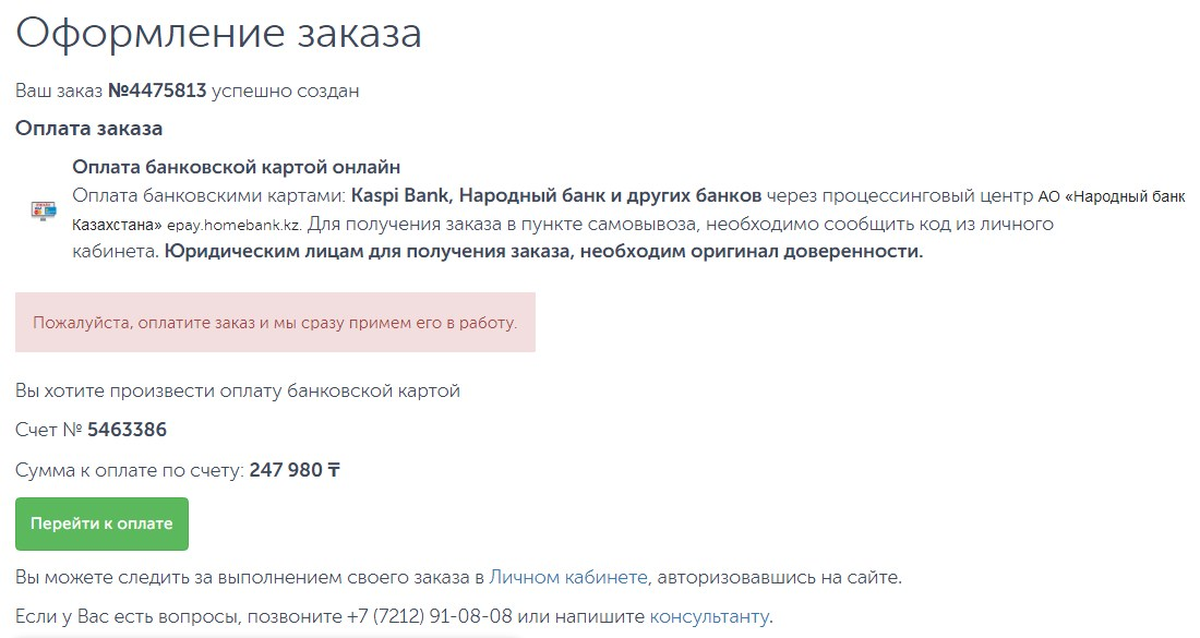 После нажатия на «Оформить заказ» на экране отобразится информация о заказе: его номер, дата и время оформления, выбранный способ оплаты и номер счета для оплаты, также вы получите SMS об успешном оформлении заказа, в случае если вы подтвердили свое желание на SMS-уведомление.