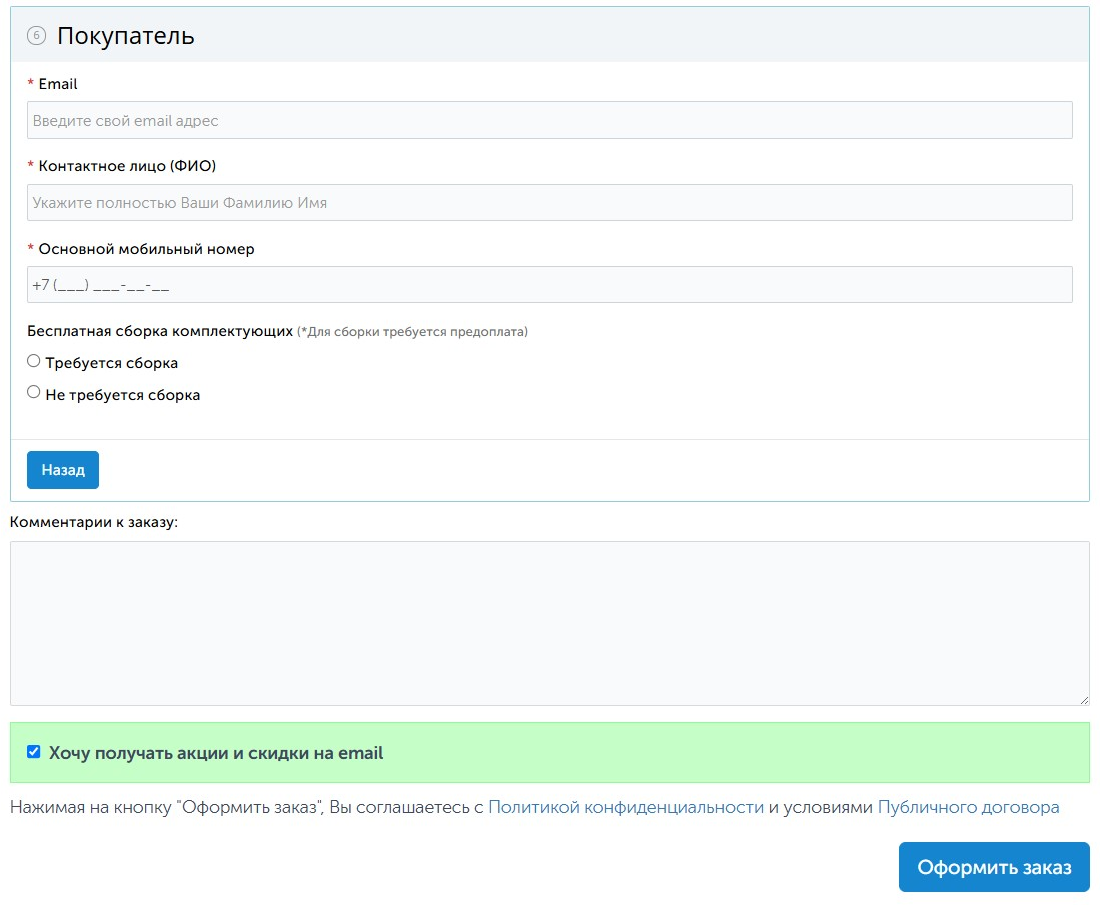 Если вам требуется сборка из приобретаемых комплектующих, установите галочку «Требуется сборка». Она выводится автоматически при наличии необходимых товаров в заказе.