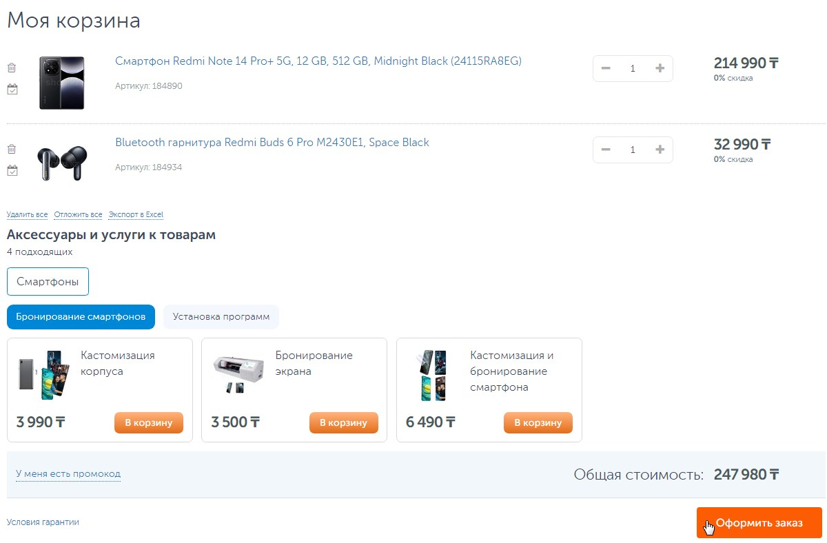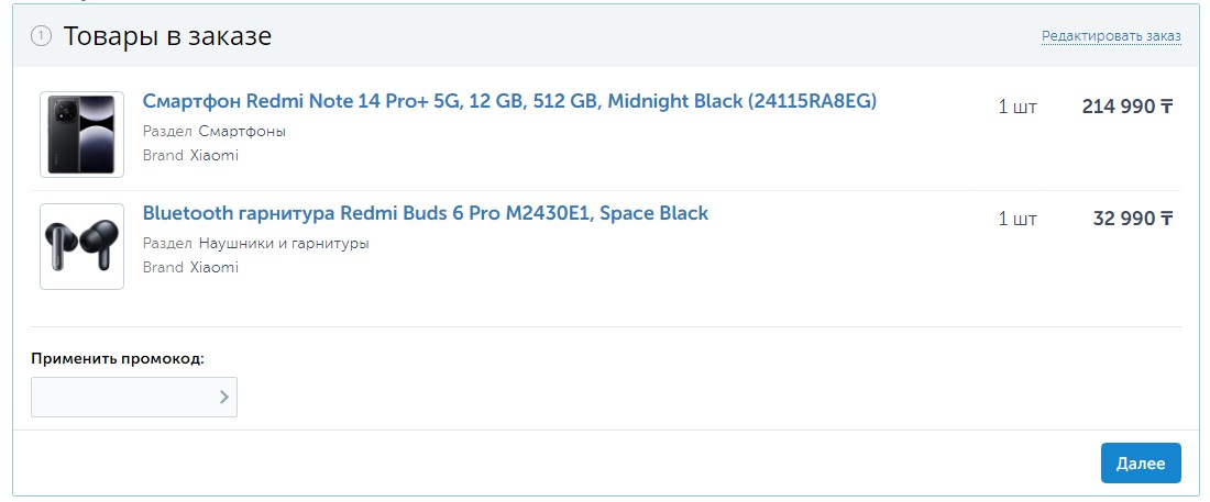 Проверьте состав заказа, количество товара, и введите промокод, если он у вас есть.