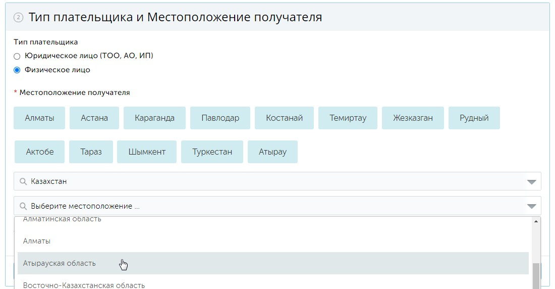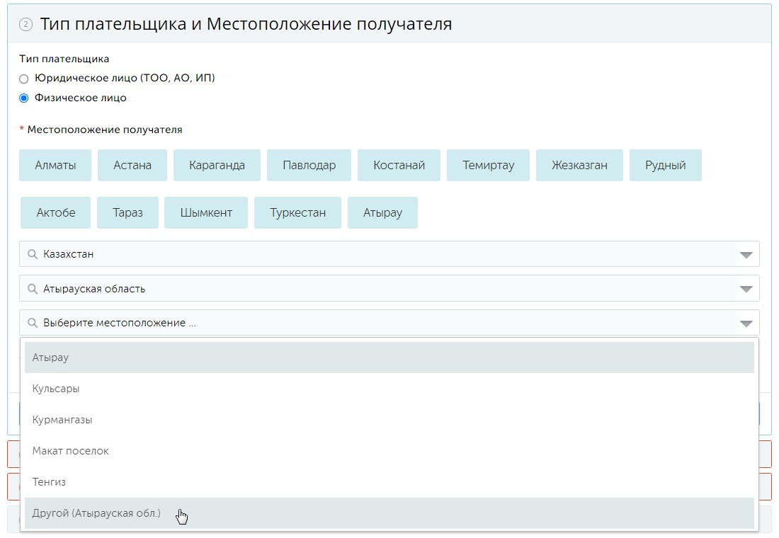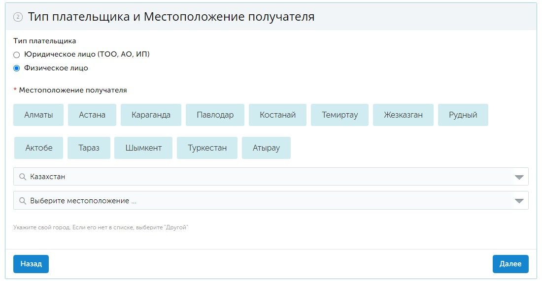 Выберите тип плательщика: физическое или юридическое лицо, и город проживания. Если вашего города нет в голубых блоках, нажмите «Выберите местоположение», и выберите область и населенный пункт: