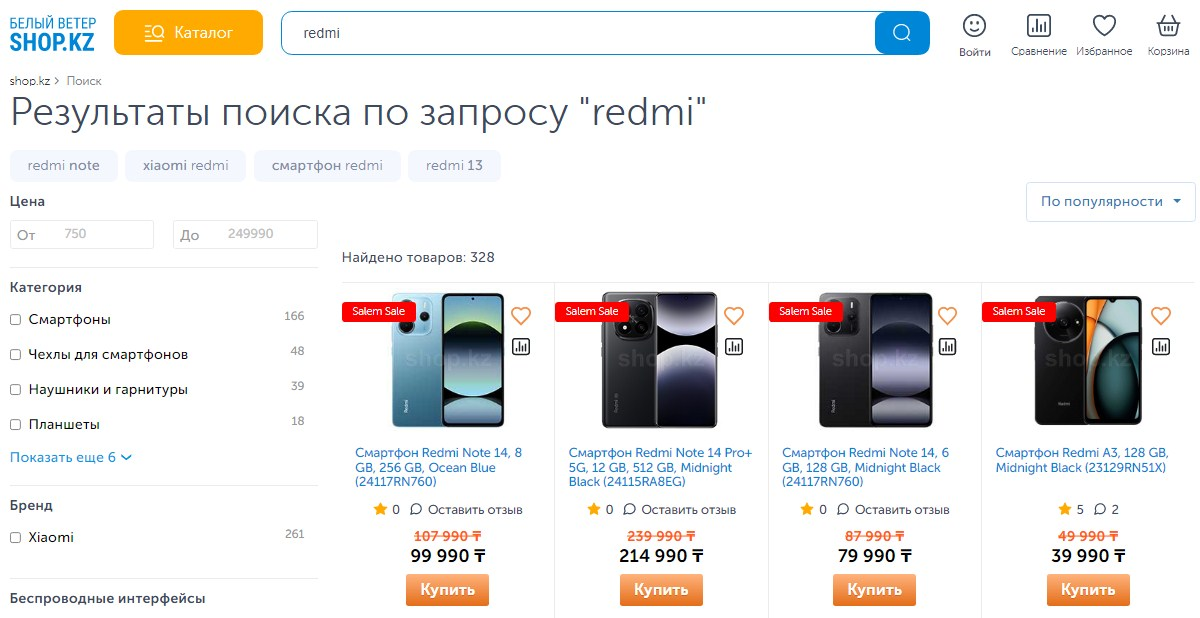На сайте shop.kz используются фильтры двух типов – чекбокс и диапазон.