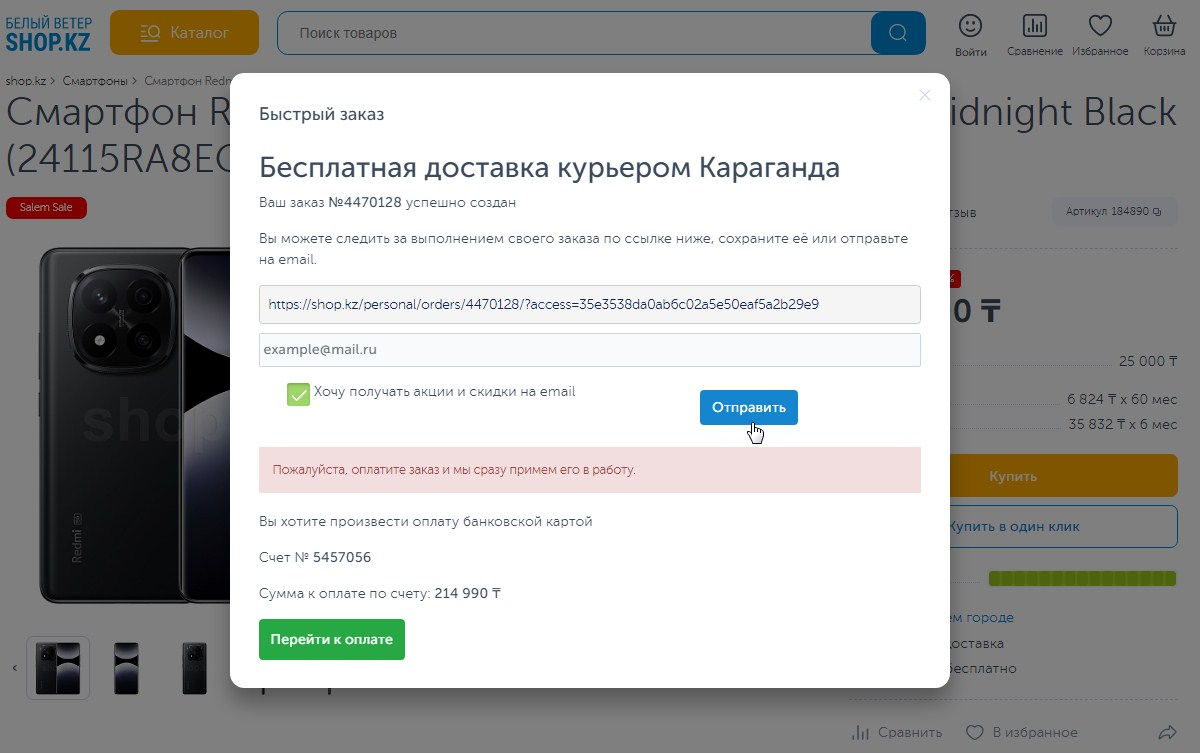 После нажатия на «Оформить заказ» на экране отобразится информация о заказе: его номер, дата и время оформления, выбранный способ оплаты и номер счета для оплаты, также вы получите SMS об успешном оформлении заказа, в случае если вы подтвердили свое желание на SMS-уведомление.