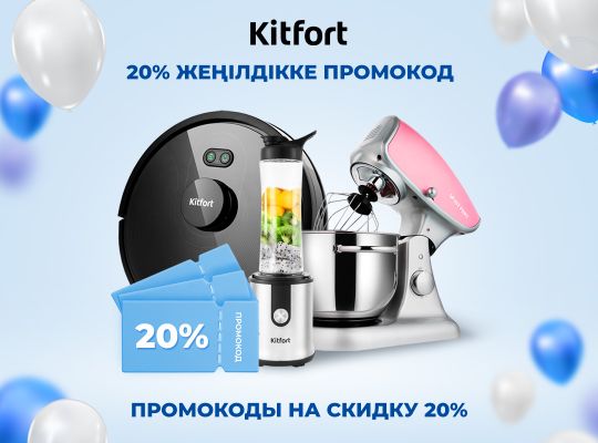 Получите шанс выиграть промокод на скидку 20% на всю продукцию Kitfort при покупке от товаров минимум на 20.000 тенге.