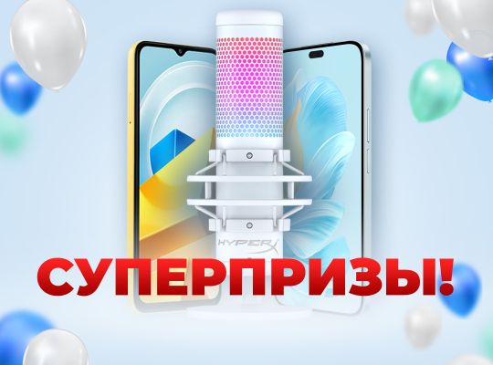 Для покупателей у нас предусмотрены СУПЕРПРИЗЫ! Среди которых смартфоны от Honor и POCO, а также шикарный микрофон от HyperX!