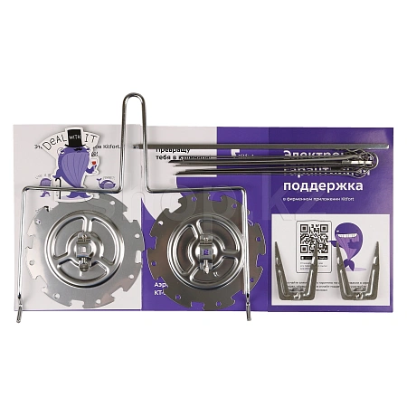 В комплекте к аэрогрилю идут сетка и сетчатый противень для приготовления или сушки продуктов, вертел с вилками для приготовления курицы-гриль или больших порций мяса, шампуры для шашлыка, вращающаяся корзина и специальный поддон для сбора жидкости.