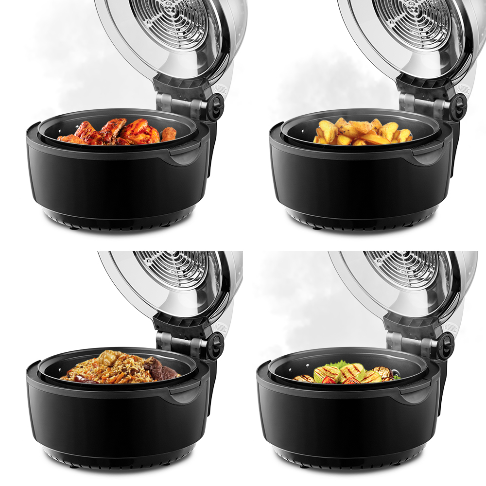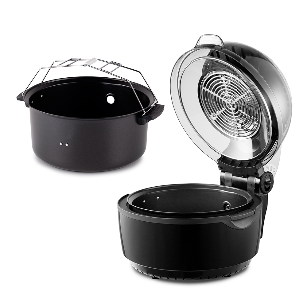 Вентилятор, расположенный в верхней части аэрогриля, обеспечивает циркуляцию горячего воздуха от нагревателя внутри рабочей ёмкости. Тем самым, продукты равномерно обжариваются со всех сторон, получаются нежными внутри и с хрустящей корочкой снаружи.