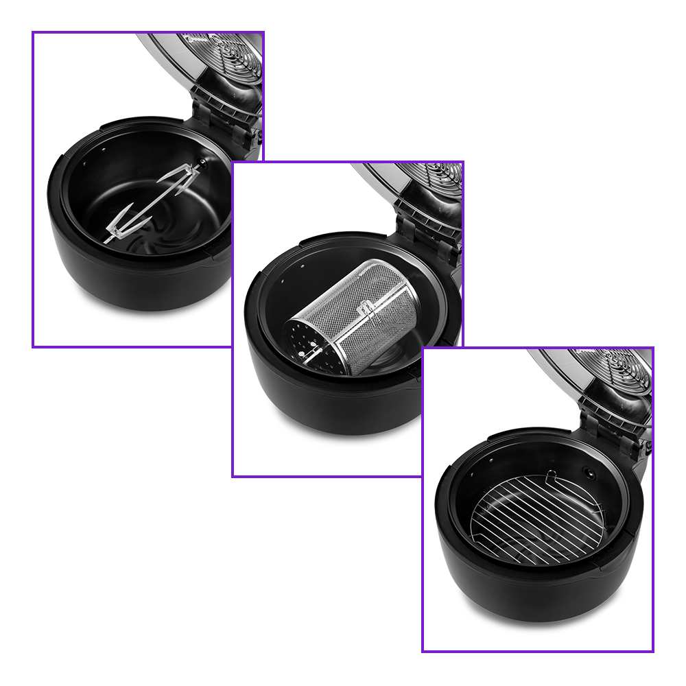 В комплекте к аэрогрилю идут вертел для приготовления курицы целиком, решётка, вращающаяся корзина. На решётке можно располагать продукты или термостойкие чаши и готовить в них. Вращающаяся корзина подходит для приготовления картошки-фри и других блюд.