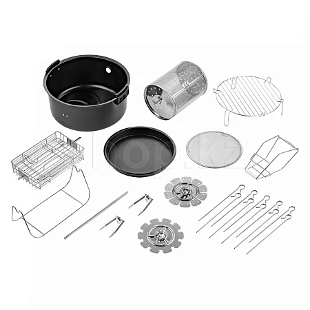 В комплекте к аэрогрилю идут вертел для приготовления курицы целиком, решётка, вращающаяся корзина. На решётке можно располагать продукты или термостойкие чаши и готовить в них. Вращающаяся корзина подходит для приготовления картошки-фри и других блюд.