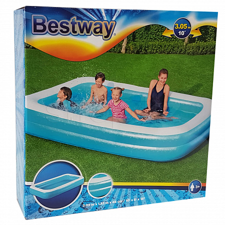 Прямоугольный семейный надувной бассейн Bestway для взрослых детей от 3 лет. Изготовлен из высококачественного винила, устойчивый, надежный и безопасный. Имеет мягкие стенки с широкими бортиками и жесткое дно из ПВХ-пленки.