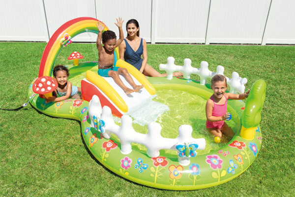Надувной игровой центр INTEX My Garden 57154NP подарит много радости и детям, и взрослым. Это самый настоящий аквапарк в миниатюре. Здесь бассейн с надувной горкой для веселой и увлекательной игры. Над бассейном возвышается огромная надувная радуга. К ней можно подключить садовый шланг, и тогда фонтанчик-разбрызгиватель создаст комфорт и прохладу даже в самое жаркое лето. Дополнительным развлечением для детей станет множество надувных игрушек, идущих в комплекте к бассейну.