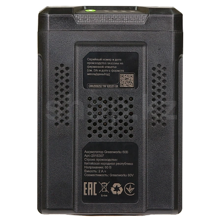 Аккумулятор GD-60 60V GREENWORKS G60B2 - это литий-ионная (Li-ion) батарея последнего поколения. Используется с техникой GreenWorks серии 60V. Батарея состоит из японских ячеек Sanyo. Снабжается встроенной электронной схемой управления. Схема предназначена для защиты от перезаряда и перегрева. 2000 циклов заряда-разряда гарантируют долгий срок службы. Особенностью Li-ion батареи является отсутствие "эффекта памяти". Важным преимуществом является быстрый заряд батареи: 100% заряд достигается за 60 минут. Для удобства, батарея снабжена индикатором уровня заряда и ударопрочным корпусом для защиты от механических повреждений.