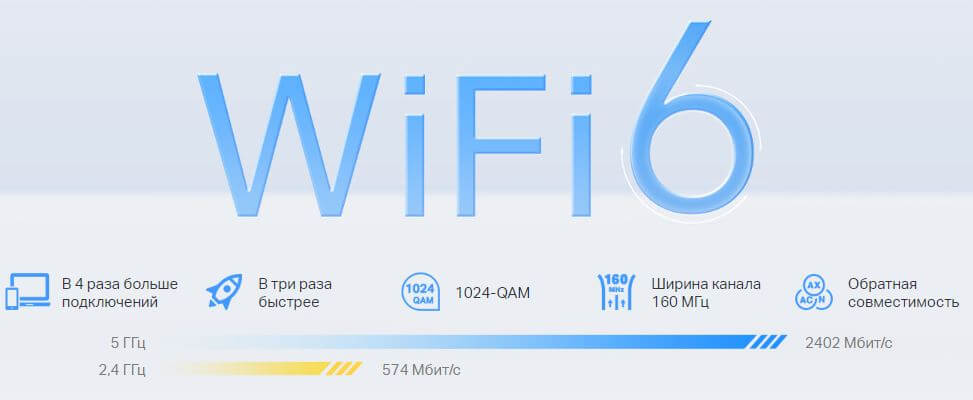 Wi-Fi 6 обеспечивает прирост по всем показателям: площадь покрытия, скорость и количество одновременно подключённых устройств.
