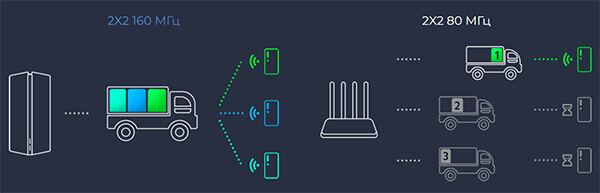 Технология OFDMA позволяет маршрутизаторам обрабатывать потоки данных от нескольких устройств одновременно, когда большие устройства требуют передачи данных, эффективно уменьшая перегрузку сети и значительно уменьшая задержку.