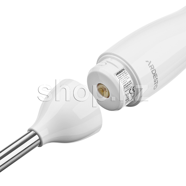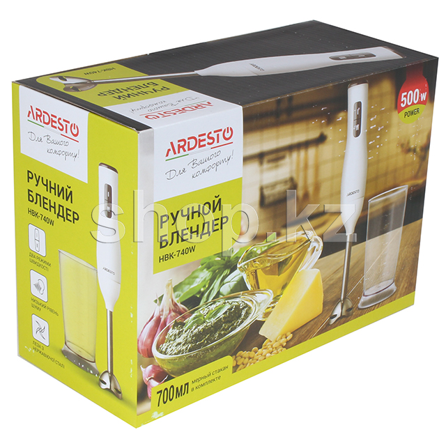 Блендер выполнен в эргономичном корпусе белого цвета из прочного пластика, а ножи — из прочной и надежной нержавеющей стали. Специальная форма ножки обеспечивает защиту от разбрызгивания. Мерный стакан с отметками рассчитан на 700 мл.