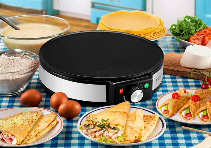 Блинницу не нужно устанавливать на плиту, поэтому можно готовить на любой удобной ровной поверхности, устойчивой к высоким температурам. С помощью палочки для распределения теста блин получается идеально ровной и той толщины, которую хотите вы.