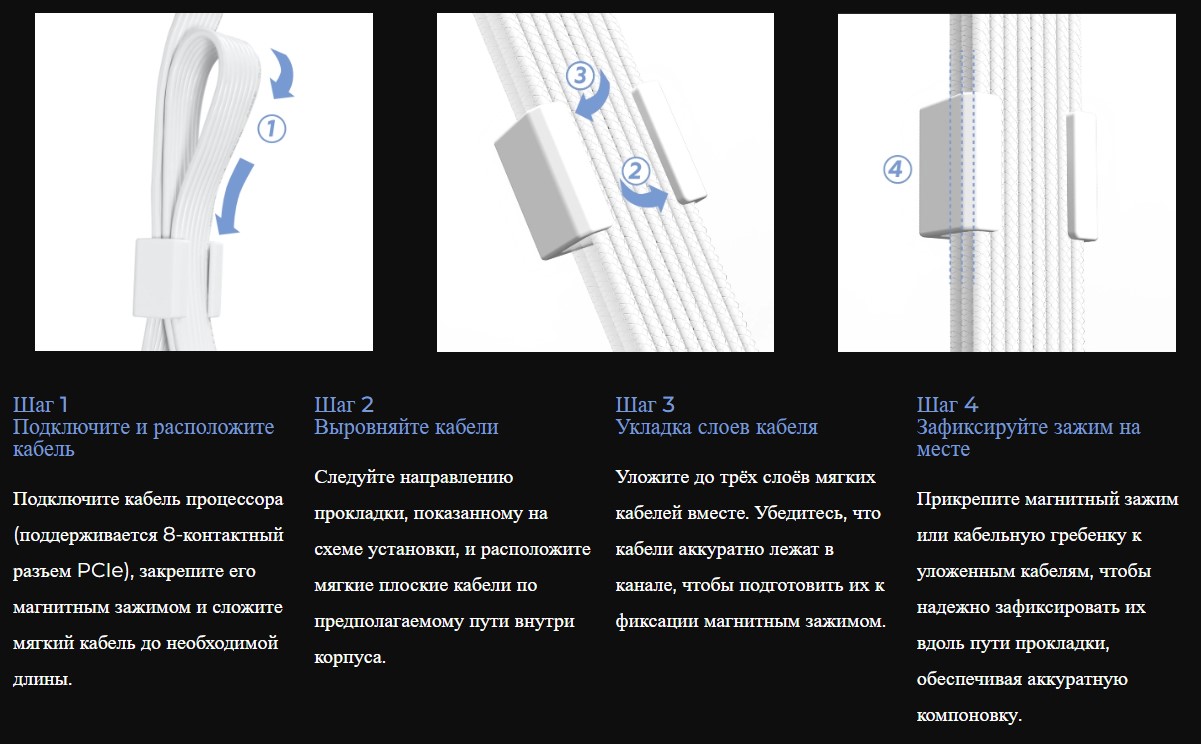 Эти сверхгибкие плоские кабели в сочетании с магнитными зажимами, фиксирующими сгибы, позволяют контролировать лишнюю длину, что делает их идеальным решением для сборок, требующих коротких кабелей ЦП или PCIe. Они идеально подходят для материнских плат с подключением сзади или блоков питания сбоку, помогая поддерживать аккуратную и организованную компоновку.