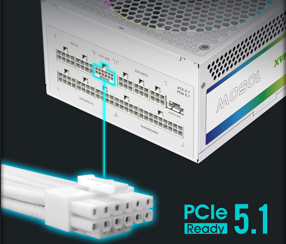 RGB-Smart включает в себя встроенный разъем питания графического процессора 12V-2x6 и поставляется с высококачественным собственным 16 контактным кабелем, обеспечивающим полную поддержку мощности для видеокарт RTX 40/50 Series и PCIE 5.1 с максимальной непрерывной выходной мощностью до 600 Вт.