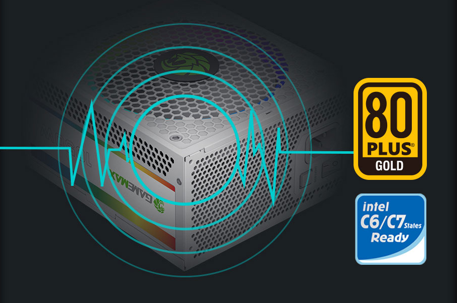 GameMax RGB 1050G WH Полностью модульный источник питания RGB-Smart сертифицирован 80 Plus Gold, обеспечивая эффективность преобразования более 90%. Он также поддерживает энергосберегающие состояния процессоров Intel C6/C7, обеспечивая стабильное эффективное и энергосберегающее решение.