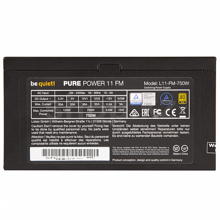 Pure Power 11 FM 750W сертифицирован 80 PLUS Gold с эффективностью до 93.9% - выдающийся уровень для этого класса БП. Самое важное преимущество - низкое энергопотребление обеспечивает экономию денег, пониженный нагрев и более тихую работу.