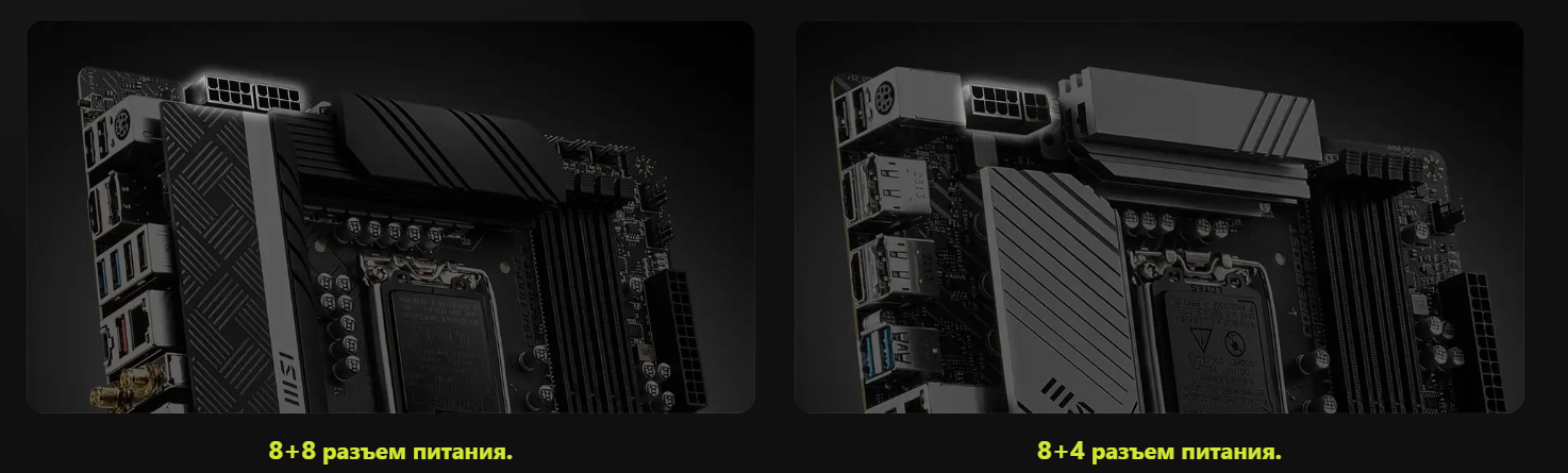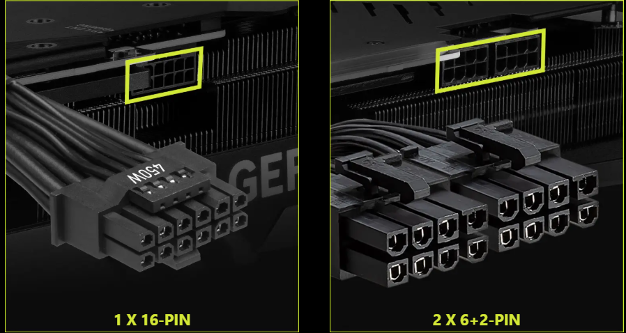 Гибкая конфигурация для графических карт с двумя типами разъемов питания, включая двойной разъем PCIe 6+2-пинов и собственный 16-пиновый разъем.