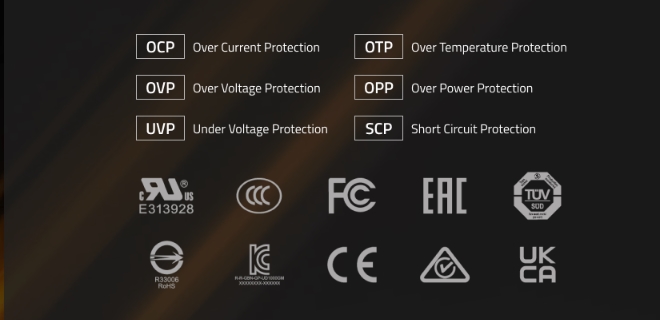 Для того, чтобы быть уверенным в безупречной работоспособности ПК в любом режиме, мы оснастили блоки питания совершенными встроенными схемами защиты OCP, OTP, OVP, OPP, UVP и SCP, а также успешно провели всестороннее тестирование и испытание наших изделий на соответствие нормам и правилам безопасности целого ряда стран.