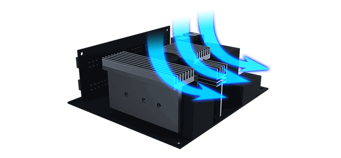 Скорость вращения вентилятора регулируется в соответствии с автоматическим определением потребляемой мощности, крыльчатка останавливается, когда система находится в режиме простоя, либо нагрузка не превышает 20 %. Гидравлический подшипник в составе вентилятора обеспечивает стабильную работу и продолжительный срок службы изделия.