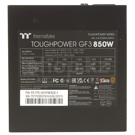 Серия Toughpower GF3 полностью совместима со спецификациями Intel ATX 3.0, что позволяет выдерживать скачок мощности до 200% и достигать эффективности до 70% при низкой нагрузке. Блоки питания GF3 кратковременно могут выдерживать 3-х кратное превышения мощности по линии питания GPU и 2-кратное по всем остальным линиям.