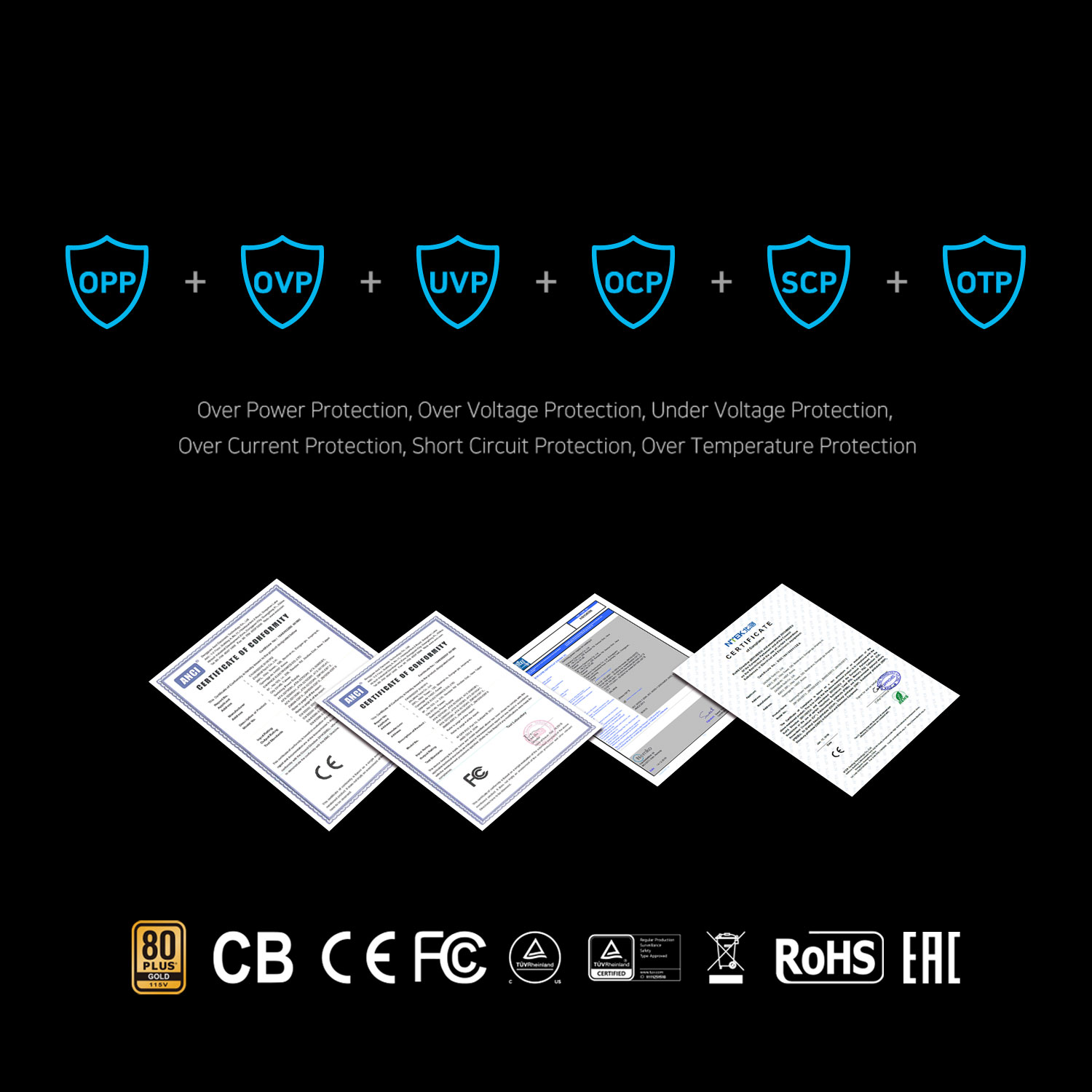 От короткого замыкания (SCP), От высокой температуры (OTP), От повышенного тока/напряжения (OVP), От пониженного тока/напряжения (UVP), От перегрузки (OPP/OLP), От перегрузки любого из выходов блока по отдельности (OCP)