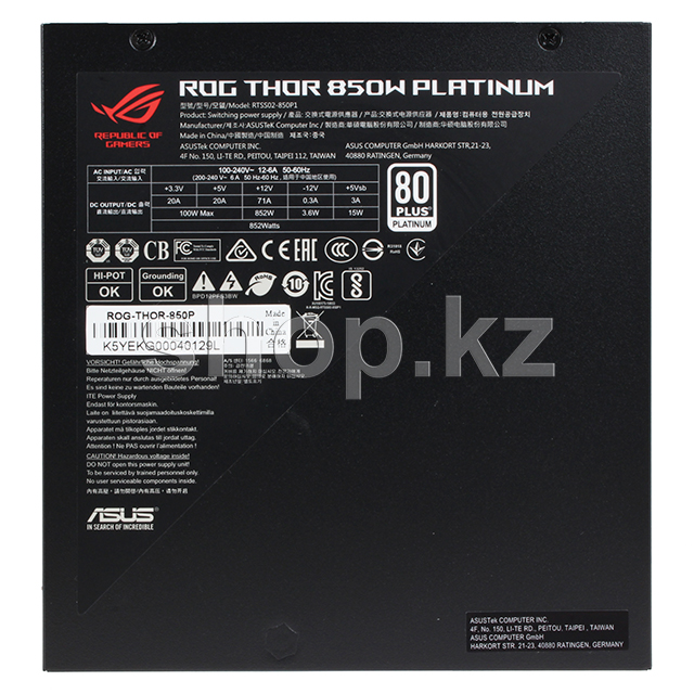 ROG Thor 850w Platinum-бұл өз жабдықтарынан тек тамаша жұмысты ғана емес, сонымен қатар керемет көріністі талап ететін энтузиастарға арналған қуат көзі. Осы санаттағы ASUS-тің алғашқы өнімі бола отырып, ол көптеген инновациялық идеяларды қамтиды: Aura Sync синхрондау технологиясымен толық түсті Aura артқы жарығы, кіріктірілген OLED дисплейі, шаңға төзімді Wing-blade желдеткіші және кәдімгі қуат көздеріне қарағанда жоғары жүктемелерде үнсіз салқындатуды қамтамасыз ететін үлкен радиатор.