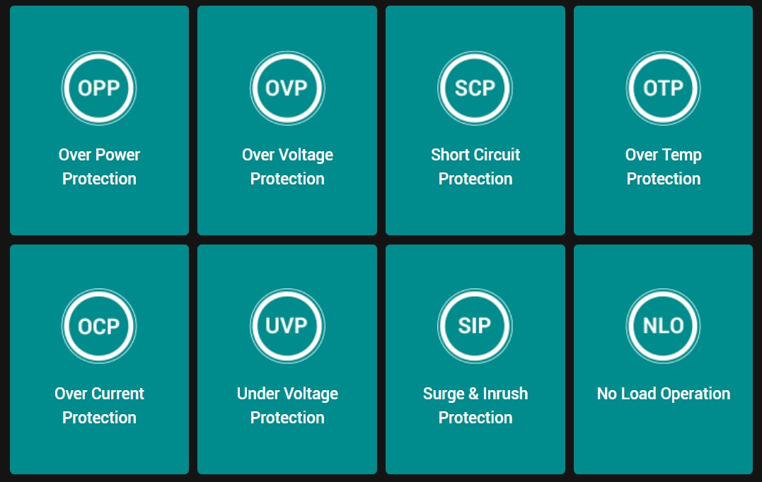 От короткого замыкания (SCP), От высокой температуры (OTP), От повышенного тока/напряжения (OVP), От пониженного тока/напряжения (UVP), От перегрузки (OPP/OLP), От скачков тока и напряжения (SIP), От перегрузки любого из выходов блока по отдельности (OCP)