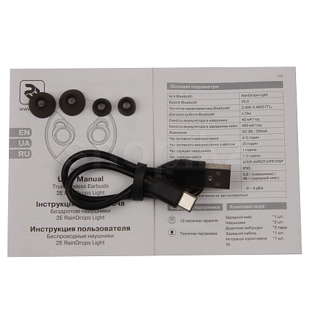 Магнитная фиксация позволяет легко поместить наушники в чехол, а когда вы достаете гарнитуру из чехла, она автоматически сопрягается с вашим устройством. Наушники 2E RainDrops комплектуются тремя амбушюрами силиконового размера и кабелем USB Type-C для зарядки чехла.
