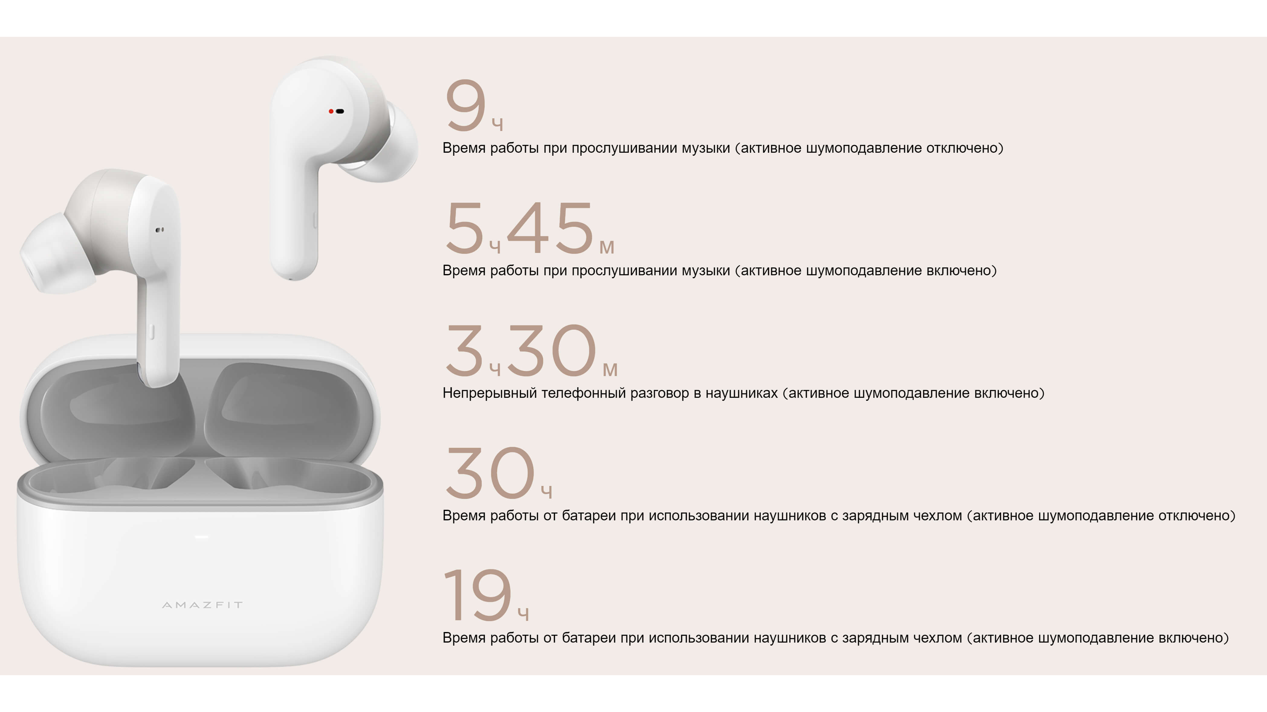 Слушайте музыку целый день. Наушники Amazfit PowerBuds Pro могут работать до девяти часов после полной зарядки батарей, а зарядный чехол обеспечивает общее время работы до 30 часов. Кроме того, чтобы слушать музыку приблизительно 2.5 часа, достаточно 15-минутной зарядки.