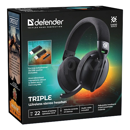 Defender Triple - стильная игровая гарнитура с проводным и двумя вариантами беспроводного подключения (BT и 2.4G). Виртуальный объемный звук 7.1, время работы до 48 часов, микрофон с шумоподавлением. Наушники закрытого типа Наушники не пропускают внешние шумы и обеспечивают максимальную звукоизоляцию. Это позволяет использовать их в шумных условиях, а также в тех случаях, когда необходимо полностью сосредоточиться на игре. Виртуальный объемный звук 7.1