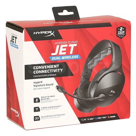Поворотный направленный микрофон гарантирует четкую связь, а время работы от аккумулятора до 25 часов позволяет играть дольше без перерывов. Легкая конструкция и дышащие сетчатые амбушюры обеспечивают максимальный комфорт во время длительных сессий. Получи новые впечатления от игры вместе с HyperX Cloud Jet! Двойная беспроводная гарнитура, совместимая с разными платформами