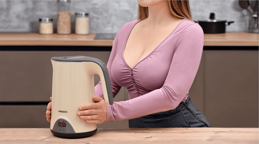 Электрочайник бежевого цвета с функцией поддержки температуры, двойными стенками, LED-дисплеем и защитой от перегрева. Материал корпуса – надежный и долговечный поликарбонат. Для комфортного использования есть удобная ручка.