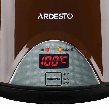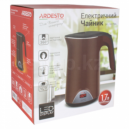 Электрочайник коричневого цвета с функцией поддержки температуры, двойными стенками, LED-дисплеем и защитой от перегрева. Объем чайника EKL-1617BN составляет 1.7 литра, а подставка обеспечивает оборот на 360°. Материал корпуса – надежный и долговечный поликарбонат. Для комфортного использования есть удобная ручка.