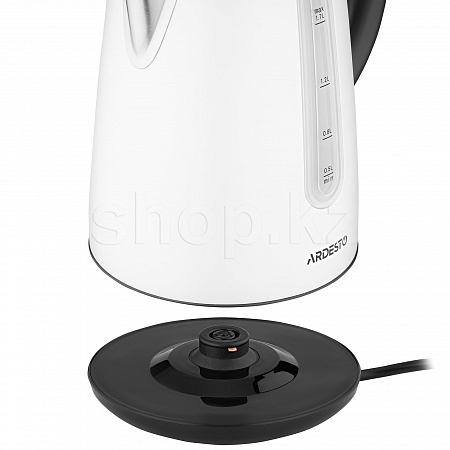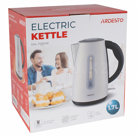 Металлический электрочайник белого цвета со Strix-контроллером для защиты от перегрева. Объем чайника EKL-F300W составляет 1.7 литра, а подставка обеспечивает оборот на 360°. Материал подставки, основы и ручки — поликарбонат черного цвета. Основная часть чайника выполнена из окрашенного металла, а шкала с отметками объема от 0.5 л до 1.7 л получила LED-подсветку.