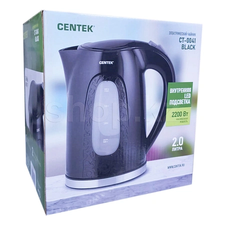 Стильный чайник Centek СТ-0041 объемом 2 л и мощностью 2200 Вт кипятит воду за несколько минут. Прибор имеет скрытый нагревательный элемент для безопасного кипячения воды.