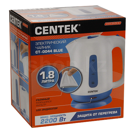 Стильный прибор, который кипятит воду за несколько минут, чайник Centek СТ-0044 объемом 1.8 л и мощностью 2200 Вт имеет скрытый нагревательный элемент для безопасного нагревания воды. Материал корпуса – высококачественный пластик.