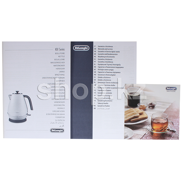 Нагревательный элемент кухонного электрического чайника Delonghi KBI2001.BZ имеет мощность 2000 Вт и относится к закрытому типу. Чайник устанавливается на круглую пластиковую подставку с подключенным сетевым шнуром и может вращаться на ней вокруг своей оси. О том, что чайник подключен к сети и включен, вас проинформирует его световой индикатор включения.