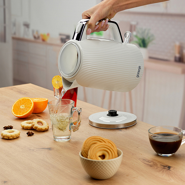 Подчеркивая высокое качество жизни, дизайн чайника продуманный и теплый. Подсветка мягко освещает стекло внутри, а декор из нержавеющей стали на основании и дне корпуса придает ощущение премиальности. Ручка идеально ложится в руку. Она эргономична, всегда прохладна и стильно смотрится на вашей кухне.