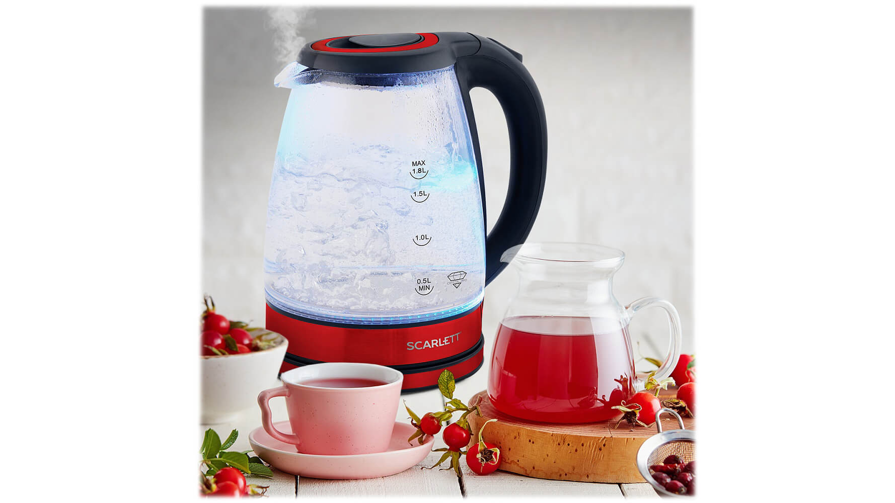 Объём чайника составляет 1.8 литра. Индикатор уровня воды поможет контролировать остаток воды в чайнике.