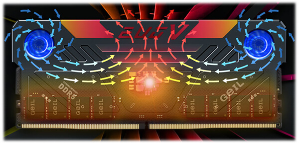 Оперативная память GeIL EVO V RGB разработана специально для повышения производительности настольных ПК игрового уровня. Модель выделяется алюминиевым радиатором оригинальной формы и двумя встроенными небольшими вентиляторами, которые повышает эффективность отвода тепла при высоких нагрузках.