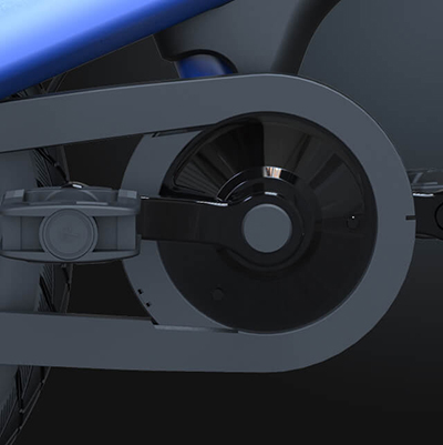 Защитный кожух из прочного пластика полностью закрывает цепь, исключая попадание в неё ног или одежды.