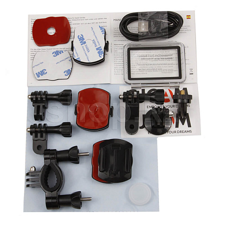 В стандартную комплектации входит большое количество креплений и специальный водозащитный чехол с которым камера может опускаться на глубину до 30 метров, а на суше данный чехол выполняет функцию защиты от физических воздействий. Благодаря креплениям из комплекта вы легко сможете закрепить вашу камеру на велосипедном руле, шлеме или любой другой плоской/изогнутой поверхности.