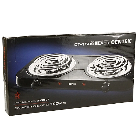 Электрическая плитка Centek CT-1509 с двумя нагревательными элементами и мощностью 2000 Вт подходит для эксплуатации на даче, в гостевых домах и компактных кухнях. Отличается надежностью и удобством в использовании. Стальные нагревательные элементы диаметром 140 мм быстро разогреются до заданной вами температуры. Прибор оснащен удобными механическими переключателями 5 режимов нагрева и световыми индикаторами работы для каждой конфорки. Усиленный металлический корпус с эмалированный покрытием легок в чистке. Благодаря прорезиненным нескользящим ножкам плита надежно крепится на поверхности.
